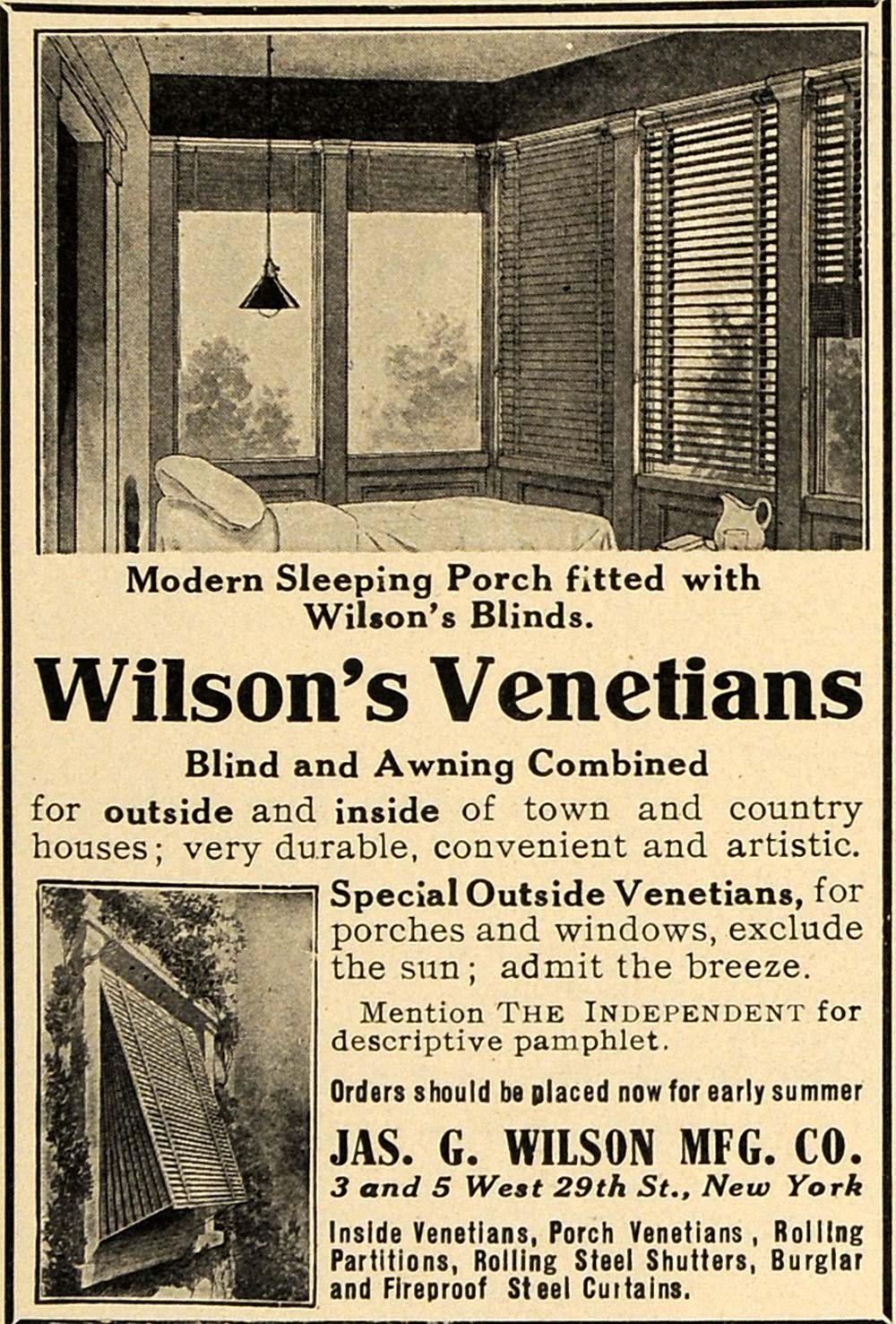 This is an original 1910 black and white print ad for Jason G. Wilson Manufacturing Co. located at 3 and 5 West 29th St., New York. Promoted in the ad is Wilson's Venetian Blinds.