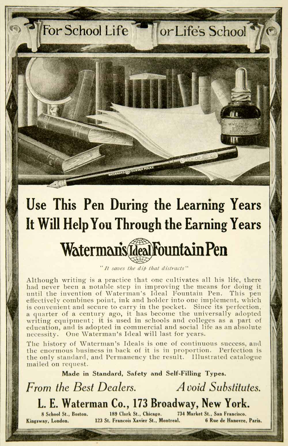 This is an original 1910 black and white print ad for Waterman's Ideal Fountain Pens, from the L. E. Waterman Company located at 173 Broadway, New York.