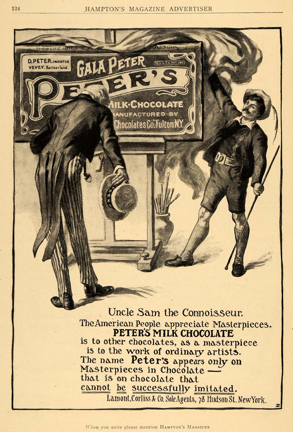 This is a rare original 1910 black and white print ad for Lamont, Corliss & Company (Sole Agents), located at 78 Hudson Street in New York. This ad features Peter's Milk Chocolate, as enjoyed by Uncle Sam.