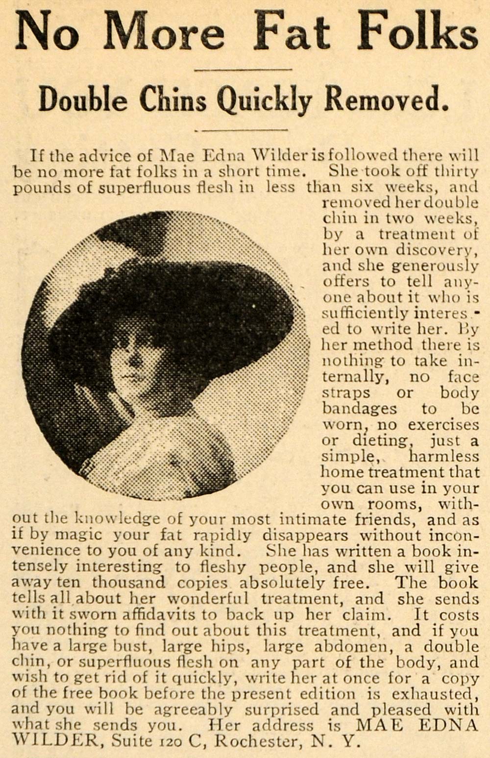 This is a small original 1910 black and white print ad for a treatment and book for weight loss by Mae Edna WIlder of Rochester, New York.