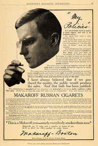 This is an original 1910 black and white print ad for Makaroff Russian Cigarets, located at 95 Milk Street in Boston, Massachusetts.