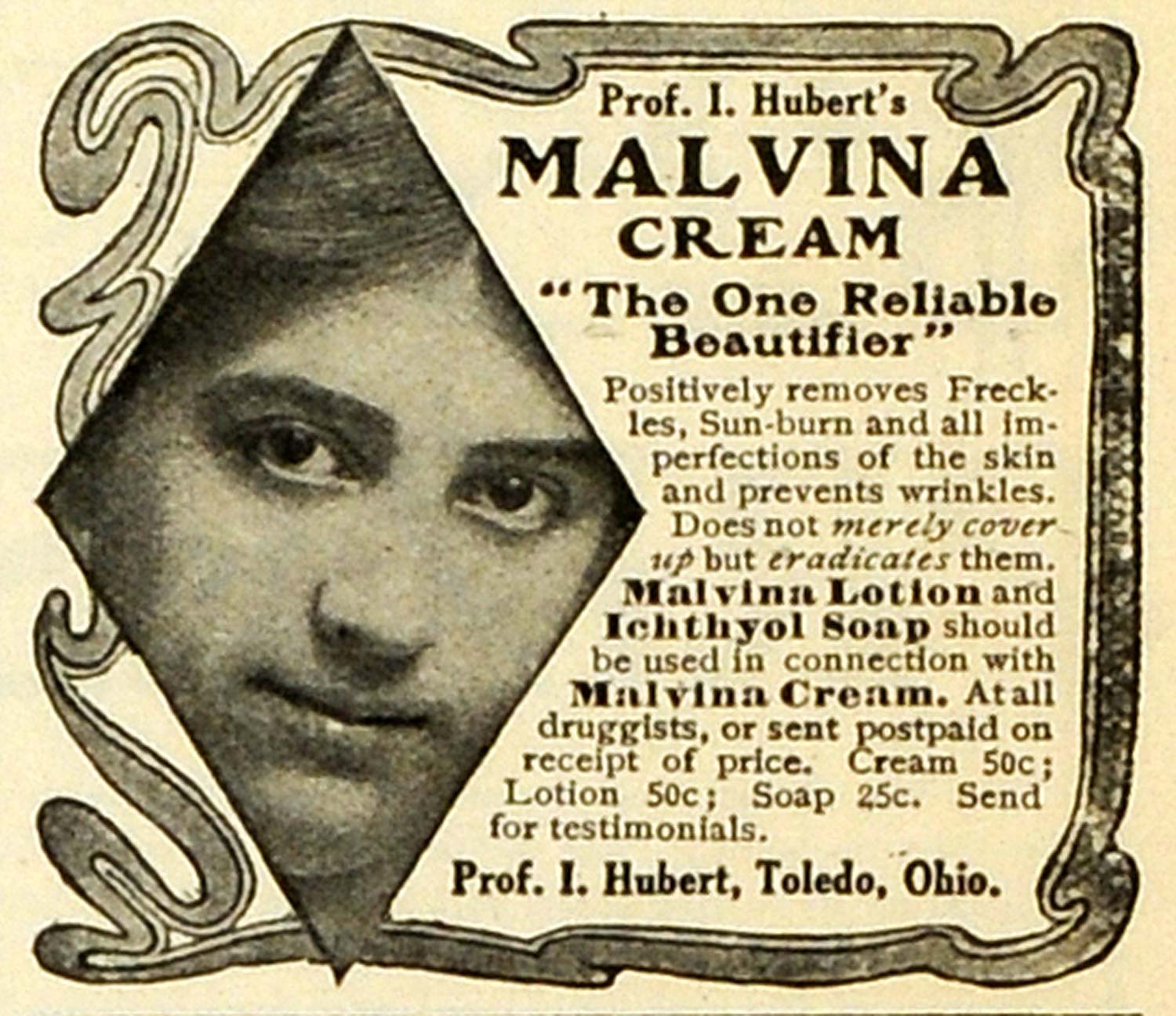 This is a small original 1910 black and white print ad for the Malvina Cream, Malvina Lotion, and Ichthyol Soap from Prof. I Hubert, Toledo, Ohio.