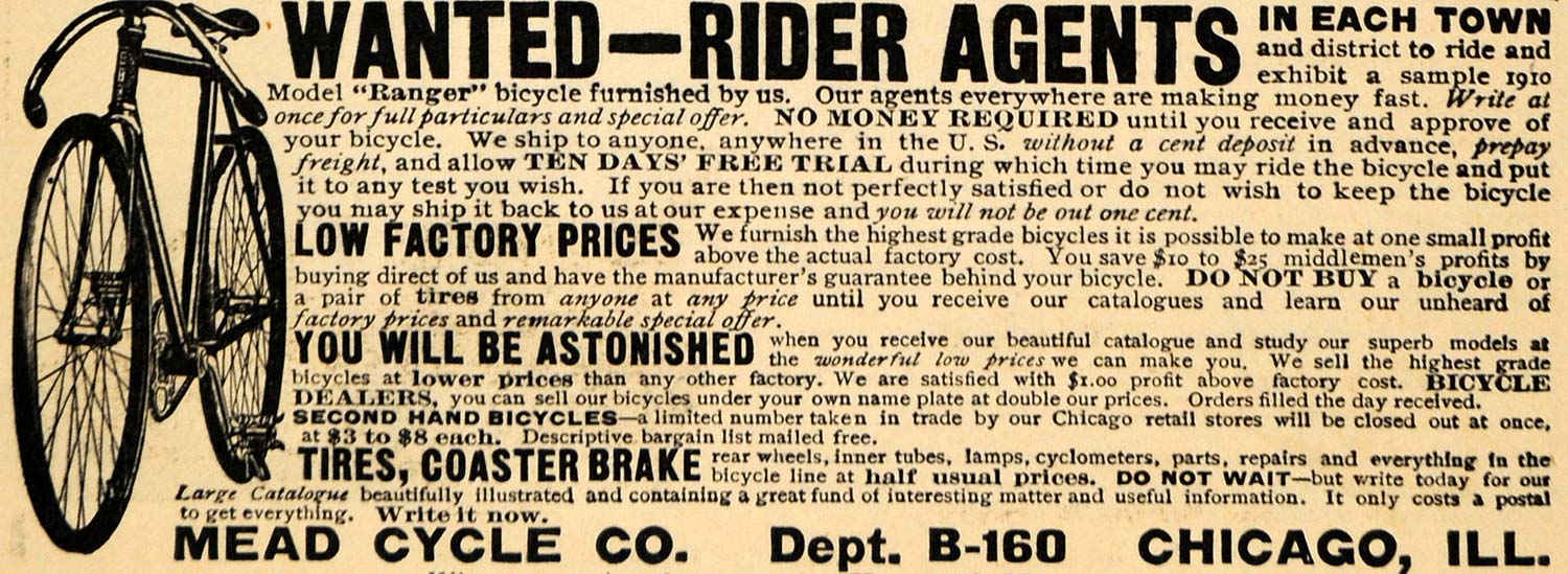 This is an original 1910 black and white print ad for the Mead Cycle Company, advertising its need for Rider Agents to ride around and promote their Model Hanger Bicycle.