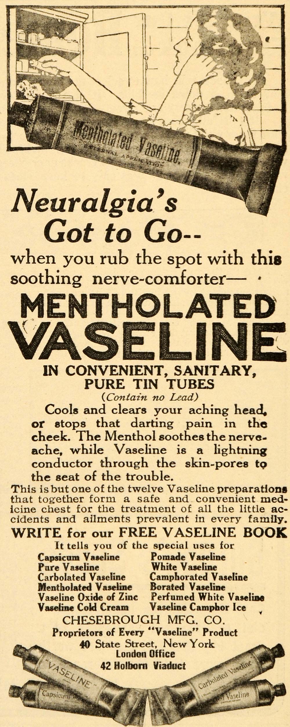 This is an original 1910 black and white print ad for Mentholated Vaseline by Chesebrough Manufacturing Company located at 40 State Street, New York City, New York and 42 Holborn, Viaduct, London.