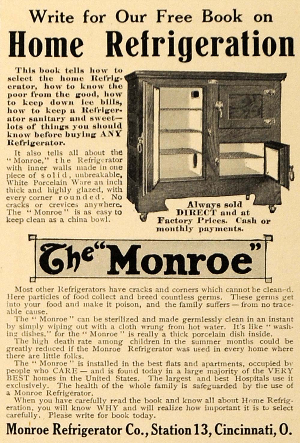 This is an original 1910 black and white print ad for the Monroe Refrigerator Company located in Cincinnati, Ohio.