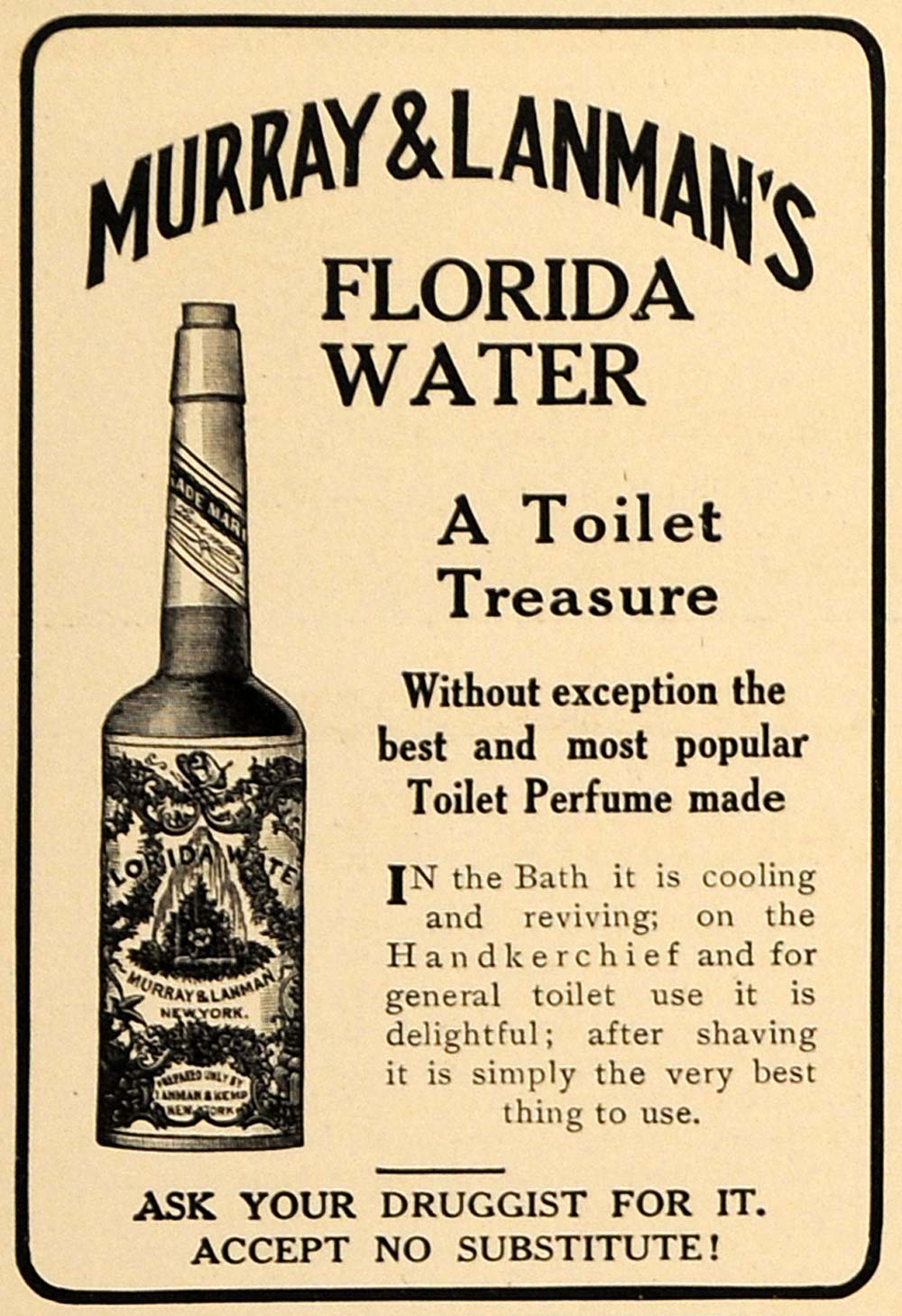 This is an original 1910 black and white print ad for the Florida Water, a toilet perfume from Murray & Lanman's Company located in New York.