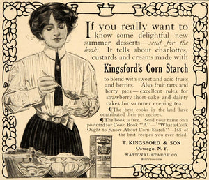 This is an original 1910 black and white print ad for Kingsford's Corn Starch by T. Kingsford and Son located in Oswego, New York. Their successors are the National Starch Company.