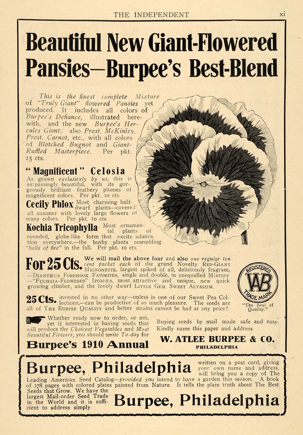 This is an original 1910 black and white print ad for Pansies, as well as other floral varieties from W. Atlee Burpee & Company in Philadelphia.