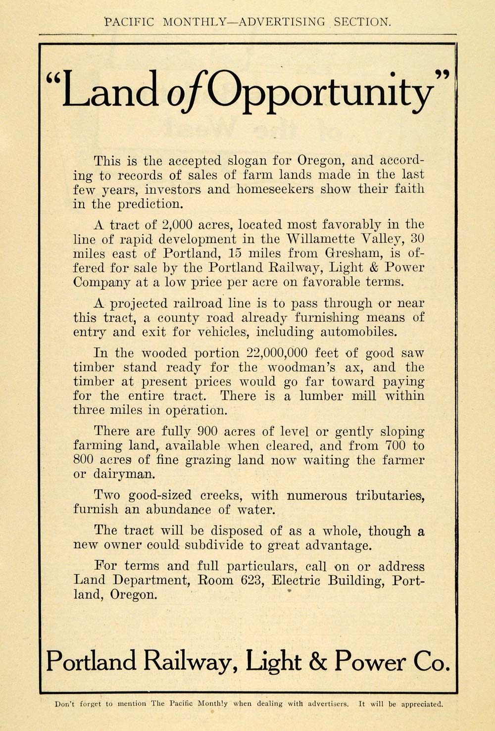 Keywords specific to this image: Vintage Advertising, Acreage, Timber, Lumber, Agriculture, Agricultural, Real Estate, Gresham, The Land of Opportunity