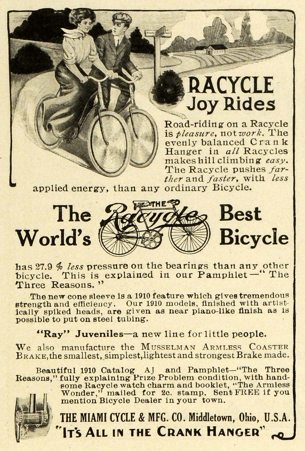 This is a small original 1910 black and white print ad for the Racycle bicycle, as well as the "Ray" for juveniles and the Musselman Armless Coaster Brake for bikes, products by The Miami Cycle and Manufacturing Company in Middletown, Ohio.