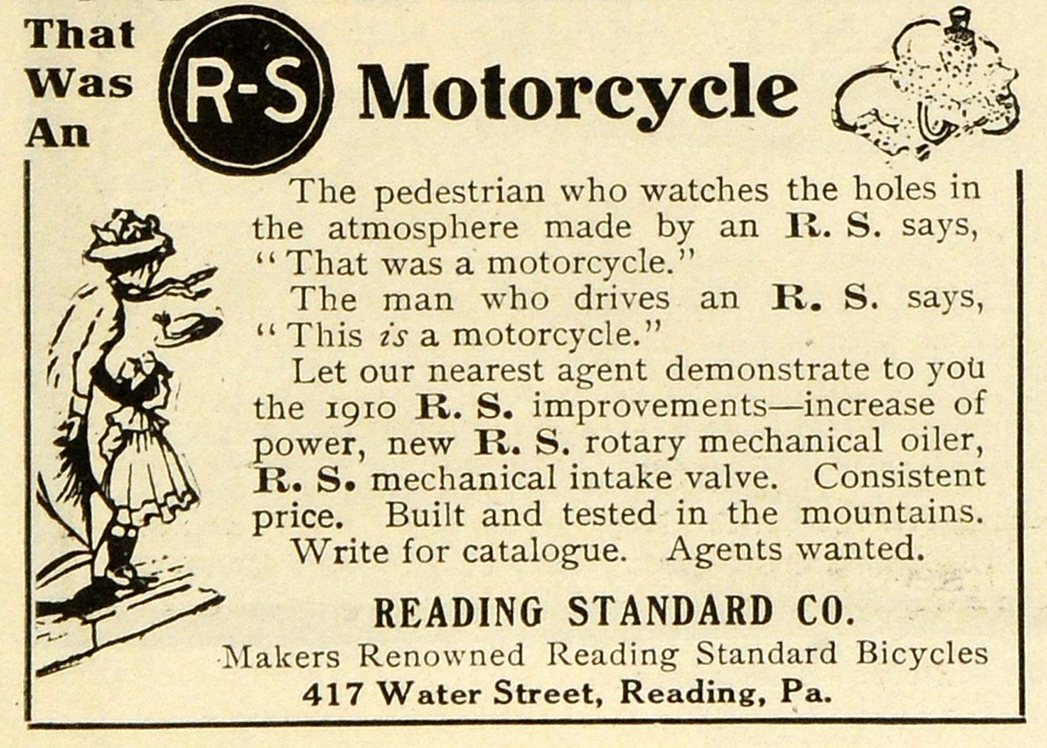 This is a small original 1910 black and white print ad for the R-S Motorcycle, a product by the Reading Standard Company, located at 417 Water Street in Reading, Pennsylvania.