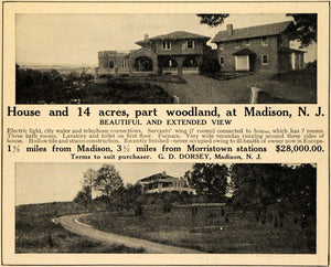 This is an original 1910 black and white print ad promoting a House and 14 acres for sale located in Madison, New Jersey. Information available from G. D. Dorsey.