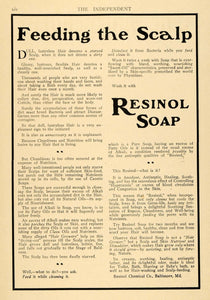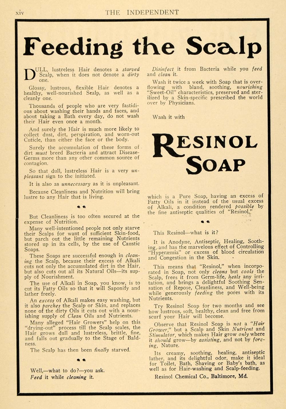 This is an original 1910 black and white print ad for Resinol Soap, a product by the Resinol Chemical Company in Baltimore, Maryland.