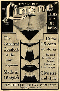 This is an original 1910 black and white print ad for the Reversible Collar Company, located at Dept. W5 in Boston, Massachusetts. This ad features their reversible Linene collars, cuffs, and bosoms for dress shirts.