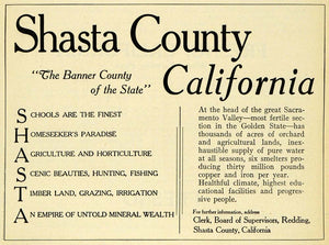 Shasta county was formed in 1850, the same time that California entered statehood. Today, the area is home to Lassen Peak, Shasta College, Simpson University, the Redding Municipal Airport, Hat Creek Radio Observatory, National University, Benton Field, Shasta Lake, Fall River Mills Airport and more.