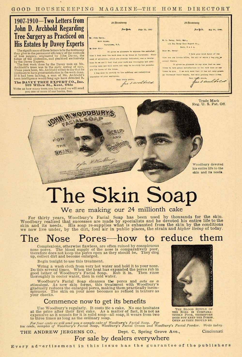 This is an original 1910 black and white print ad for John H. Woodbury's Facial Soap by The Jergens Company located at Dept. C, Spring Grove Ave, Cincinnati, Ohio. The ad has an article about how to reduce nose pores.