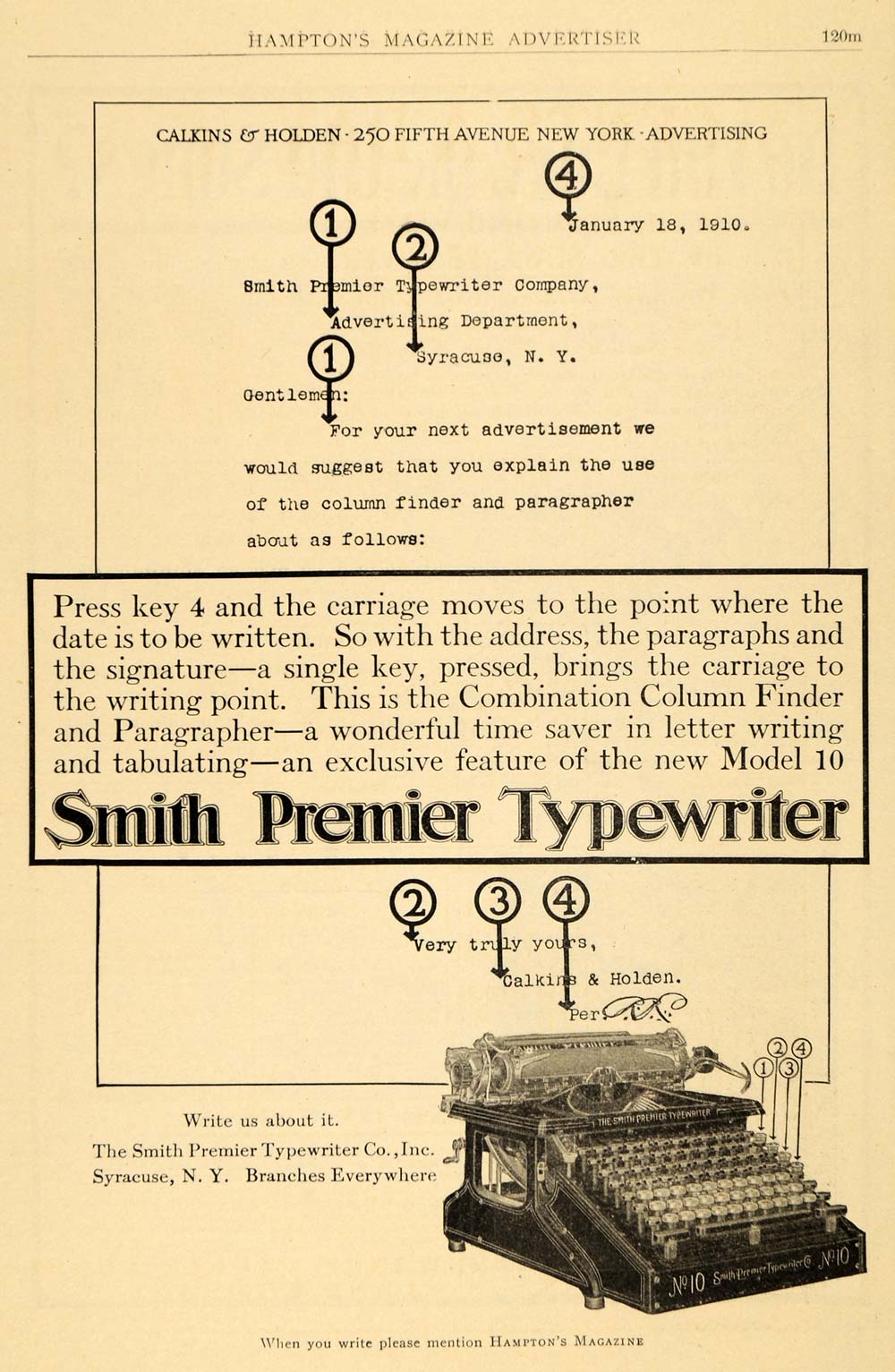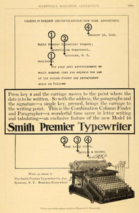 This is an original 1910 black and white print ad for the Smith Premier Typewriter Company, Incorporated, located in Syracuse, New York. This ad features their Smith Premier Typewriter with the Combination Column Finder and Paragrapher.