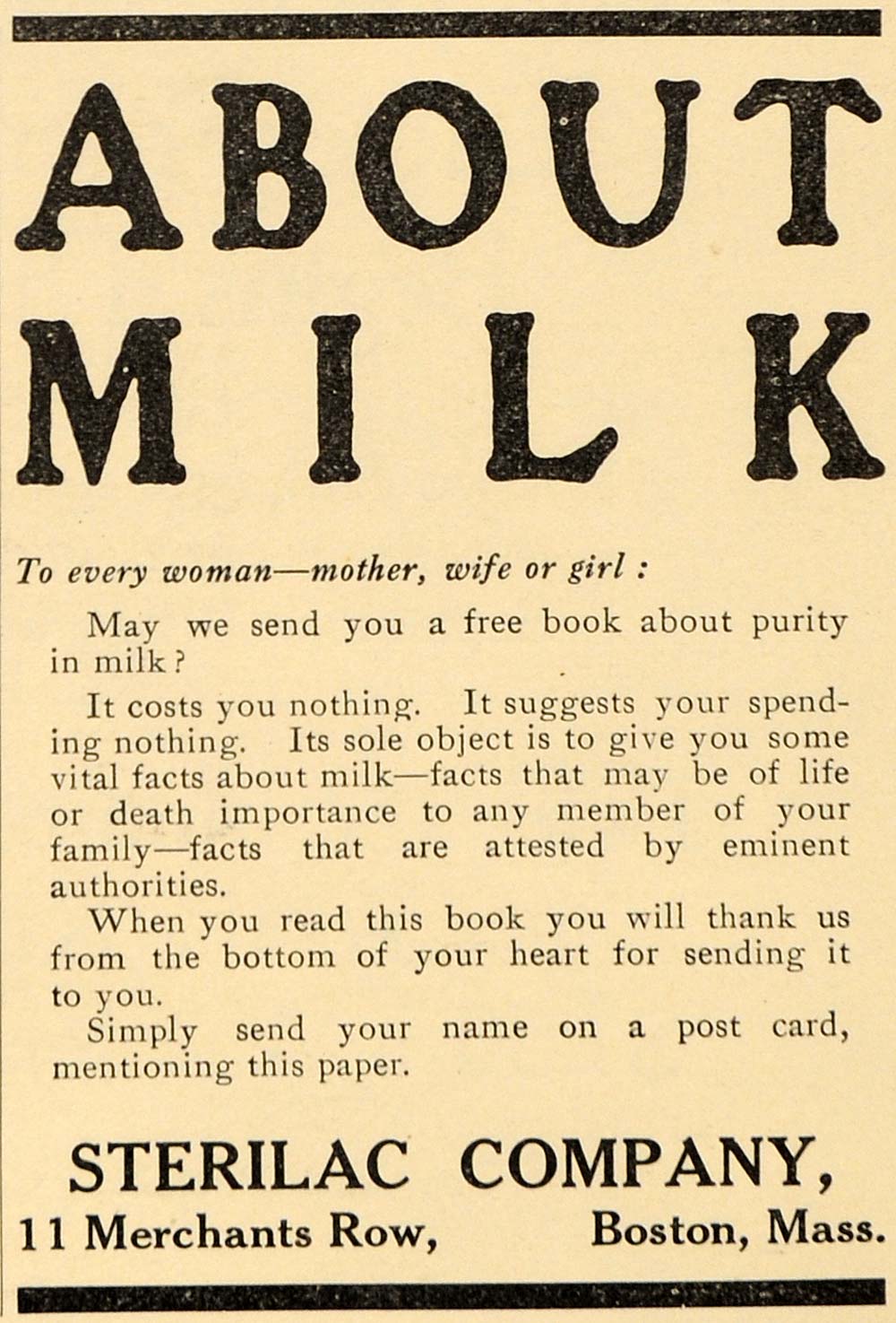 This is an original 1910 black and white print ad for the Sterilac Company promoting a free book about purity in milk , "About Milk", located at 11 Merchants Row, Boston, Massachusetts.