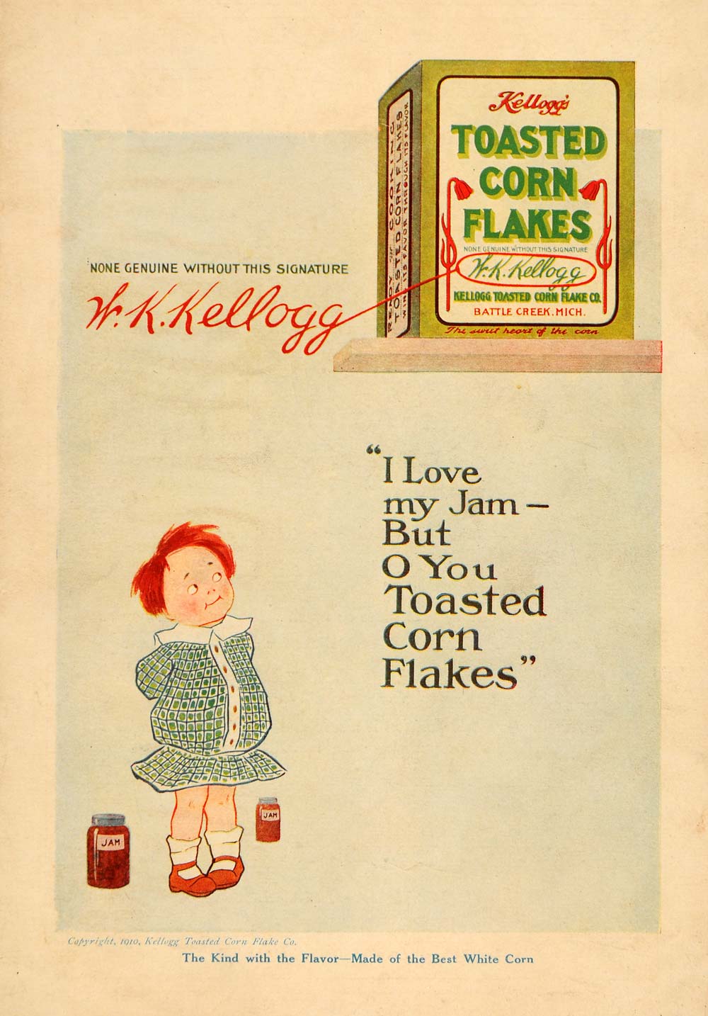 This is an original 1910 color print ad for the Kellogg Toasted Corn Flake Company, featuring their signature W. K. Kellogg Toasted Corn Flakes, a favorite of little redheaded children everywhere. The Kelloggs Company is located in Battle Creek, Michigan.