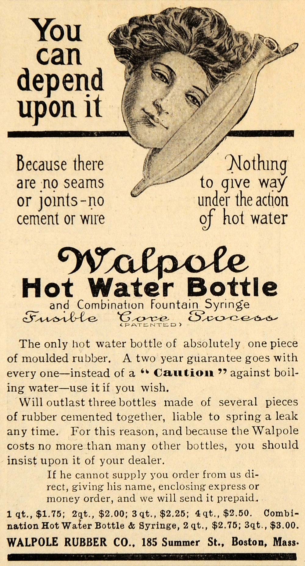 This is an original 1910 black and white print ad for the Walpole Hot Water Bottle and Combination Fountain Syringe. This a product of the Walpole Rubber Company, located at 185 Summer Street, Boston, Massachusetts.