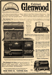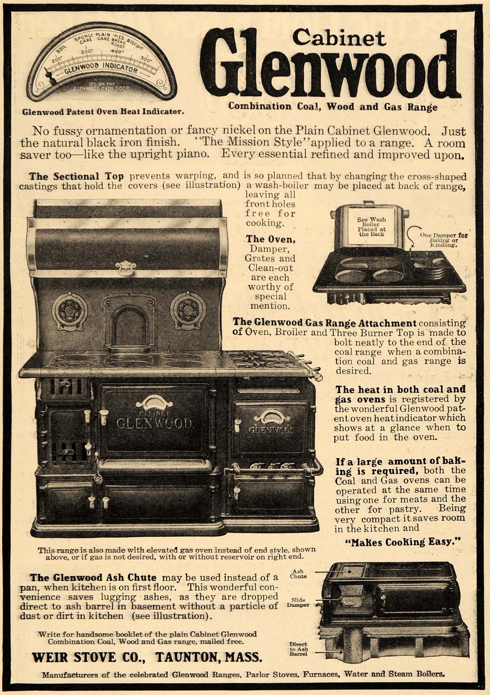 This is an original 1910 black and white print ad promoting the Glenwood Cabinet Stove with combination of coal, wood and gas range and Glenwood Patent Oven Heat Indicator from