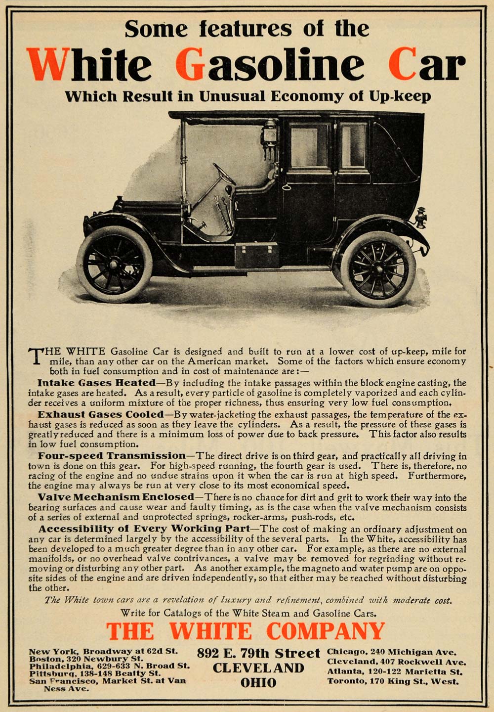 This is a tiny original 1910 color print ad for the White Gasoline Car from The White Co. located in Cleveland, Ohio.