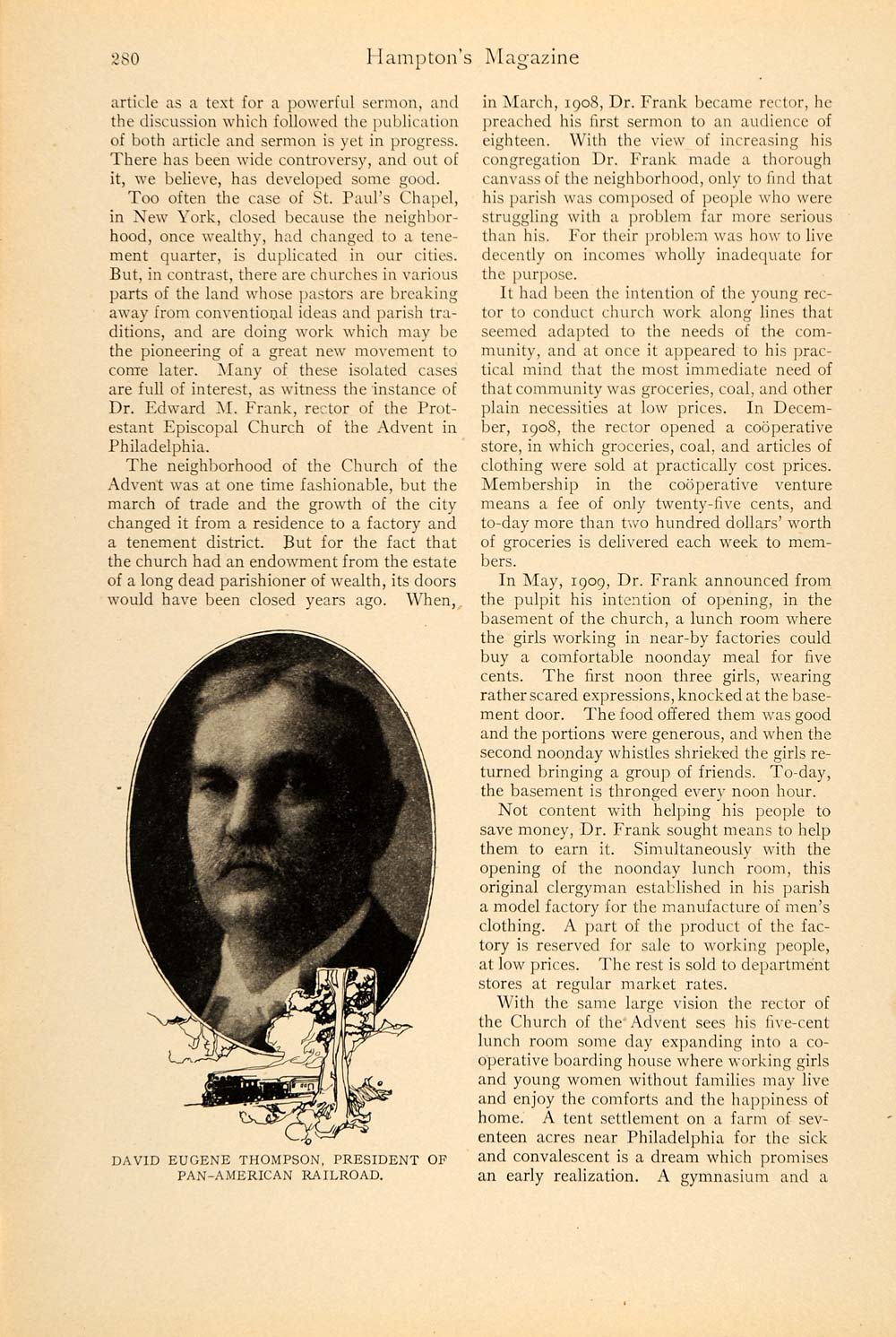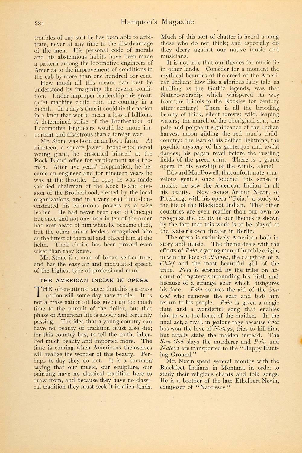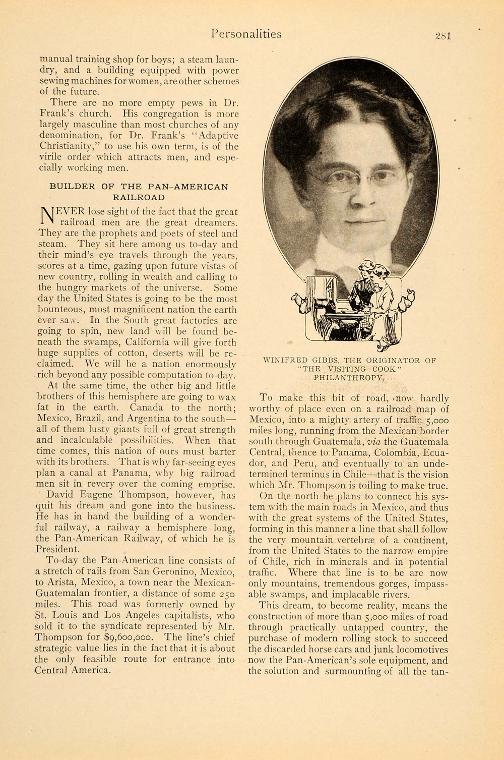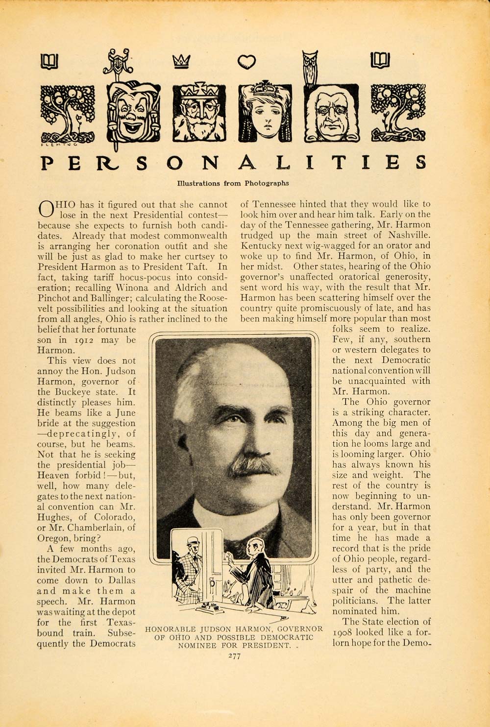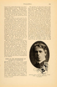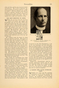 This is an original 1910 8 page article titled, "Personalities." Small articles include, "The American Indian in Opera," "Chief of the Brotherhood of Locomotive Engineers," "The Visiting Cook," "Builder of the Pan-American Railroad," "A Parson who Saves Stomachs First, and "The New Minister to China". Pictured are images of Judson Harmon-- the governor of Ohio, William James Calhoun, Reverend Edward Frank, David Eugene Thompson, Winifred Gibbs, Warren S. Stone, and Arthur Nevin. Please note that the 8 pages are printed on four pages, front and back. Please see additional images.