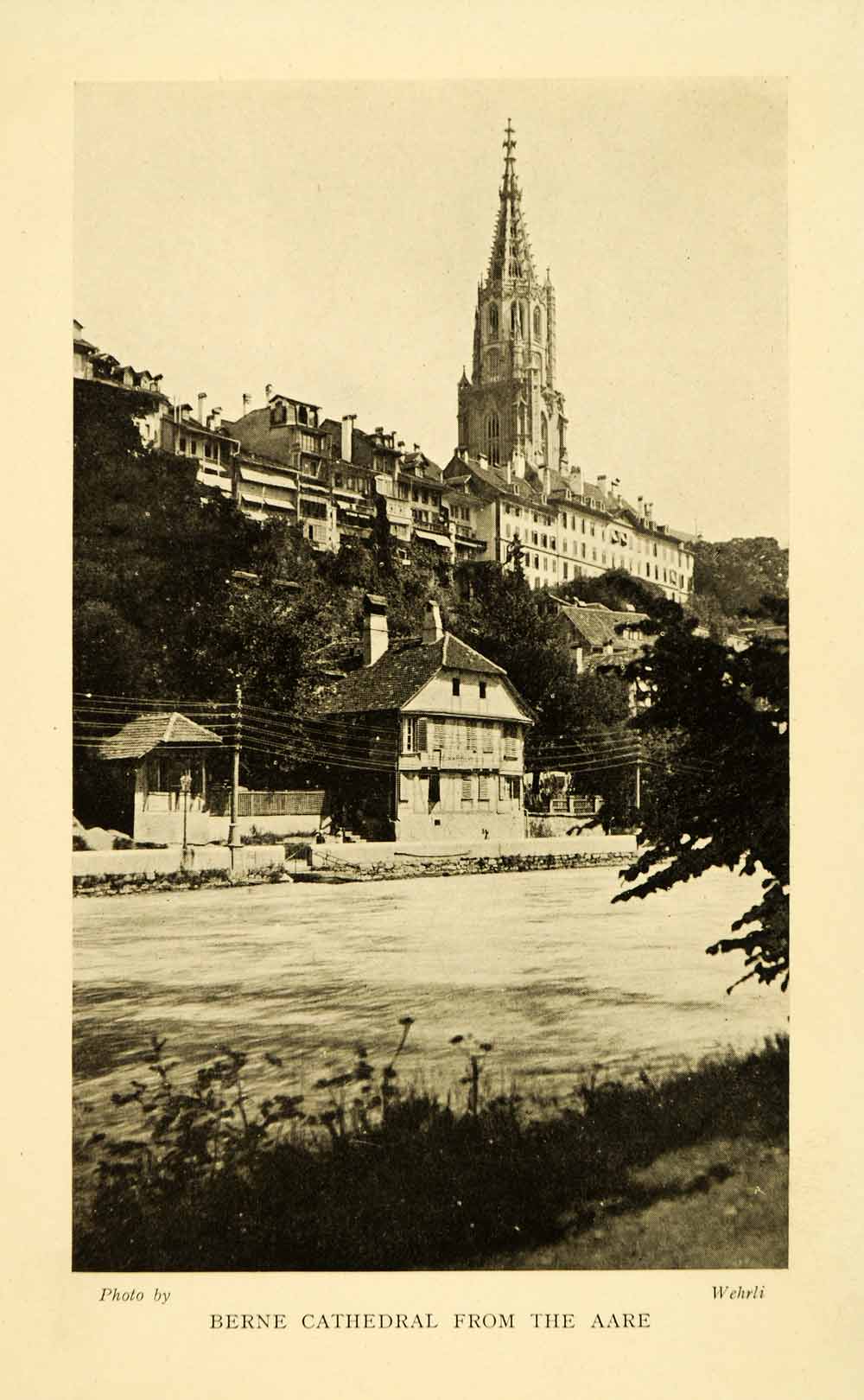 This is an original 1910 black and white halftone print of "Berne Cathedral from the Aare." This image captures the Müster of Bern. This Gothic cathedral is located in the old city of Bern, Switzerland. Construction on the structure commenced in 1421, but its tower was not completed until 1893. The main portal of the Cathedral retains one of the most complete sculpture collections form the Late Gothic period. The Cathedral is a Swiss Cultural Property of National and Regional Significance.