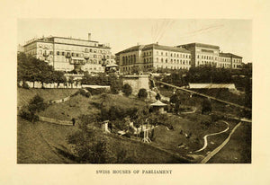This is an original 1910 black and white halftone print of "Swiss Houses of Parliament." The Swiss House of Parliament, or Bundeshaus, stands atop a hill overlooking the Aare River in Bern, Switzerland. The building was completed in 1902.
