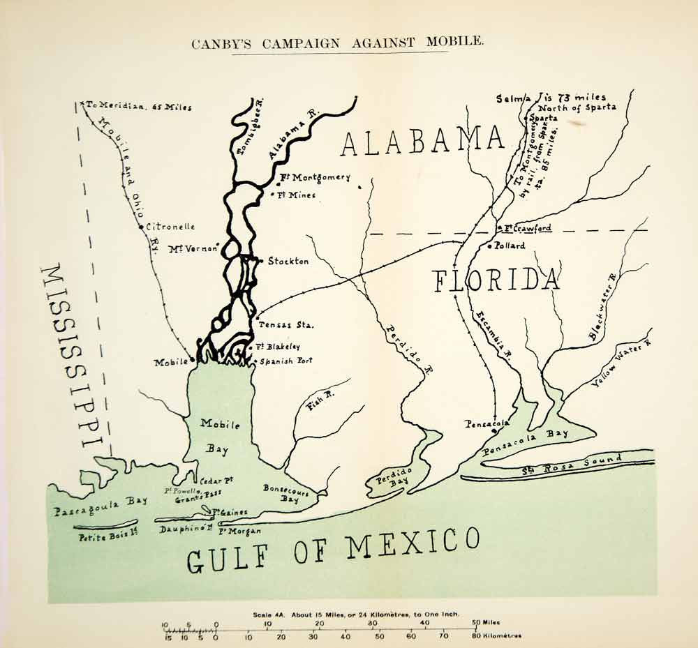 1910 Lithograph Map American Civil War Edward Canby Mobile Alabama Raid CWM1
