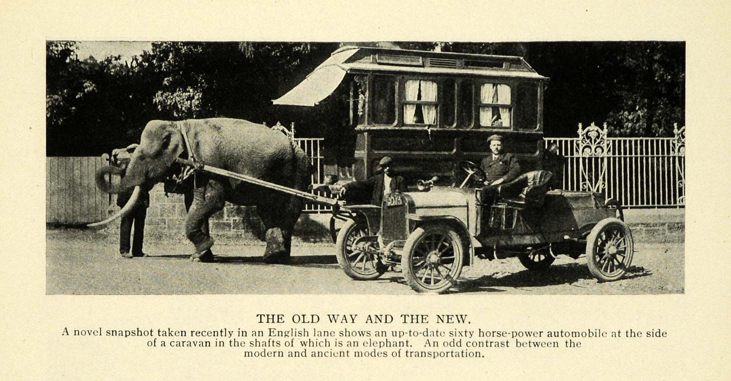 This is an original 1910 halftone print of an automobile being driven next to an elephant pulling a cart. The caption writes, "A novel snapshot taken recently in an English lane shows an up to date sixty horsepower automobile at the side of a caravan in the shafts of which is an elephant..."