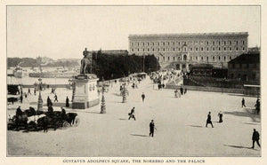 This is an original 1910 halftone print of Gustavus Adolphus Square, the Norrbro and the Palace in Stockholm, Sweden.