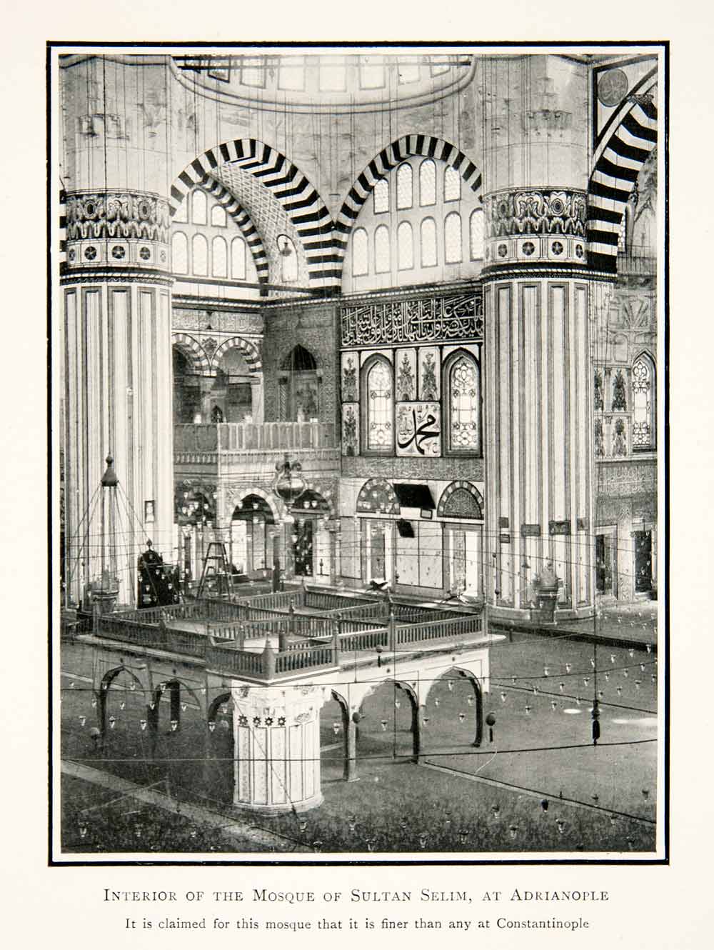 This is an original 1910 black and white halftone print of "The Interior of the Mosque of Sultan Selim, at Adrianople."