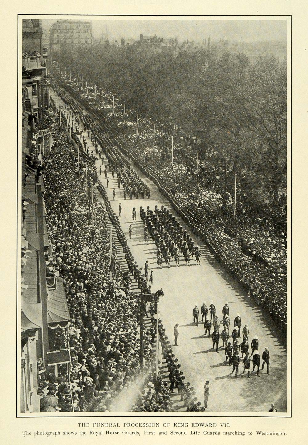This is an original 1910 halftone print featuring an aerial view of the funeral procession of King Edward VII. The photograph shows the Royal Horse Guards, first and second Life Guards marching to Westminster, an area of central London, England.