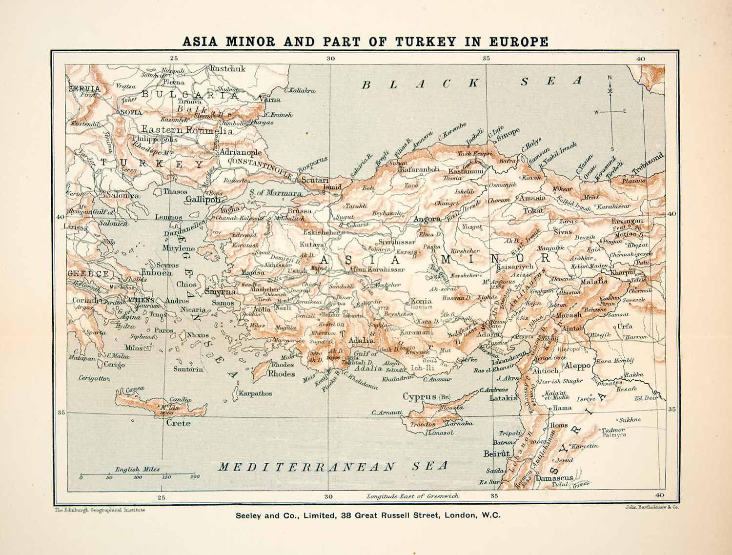 This is an original 1910 color relief line-block map of "Asia Minor and Part of Turkey in Europe;" from the then Seeley and Co., Limited, 38 Great Russell Street, London, W.C. and the Edinburgh Geographical Institute.