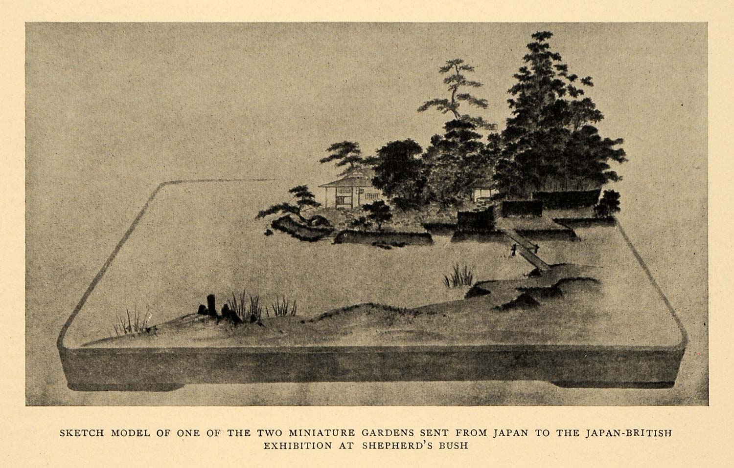 This is an original 1910 halftone print of a sketch model of on of the two miniature gardens sent from Japan to the Japanese-British Exhibition at Shepherd's Bush, an area west of London (located in the London Borough of Hammersmith and Fulham).