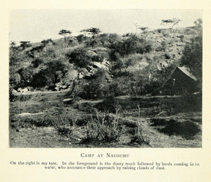 This is an original 1910 halftone print of a tent camp at the right in Naisichu, Ethiopia.