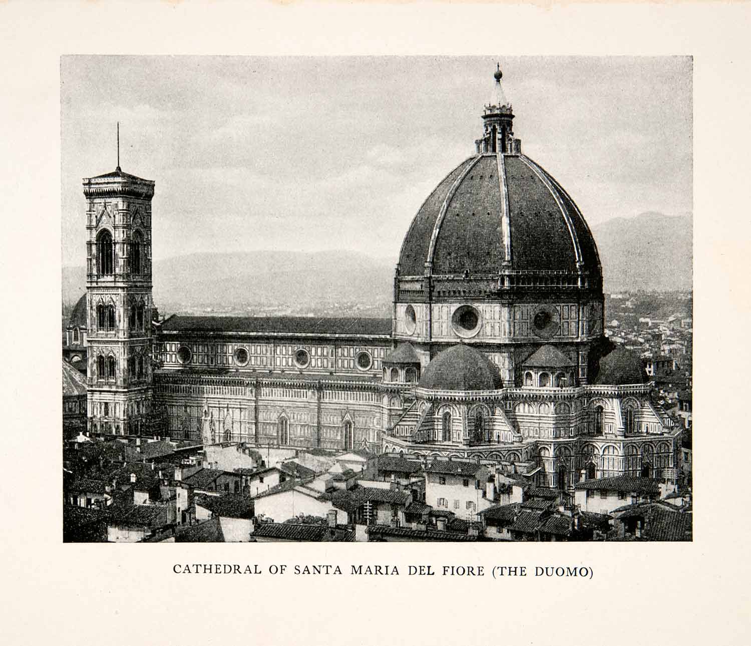This is an original 1910 black and white halftone print of the majestic Santa Maria del Fiore Cathedral, beside which is the famous Giotto's Campanile (bell tower), located in Florence, Italy.