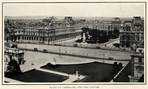 This is an original 1910 halftone print of the Place de Carrousel and the Louvre, with the Napoleonic arch of triumph in lower left.