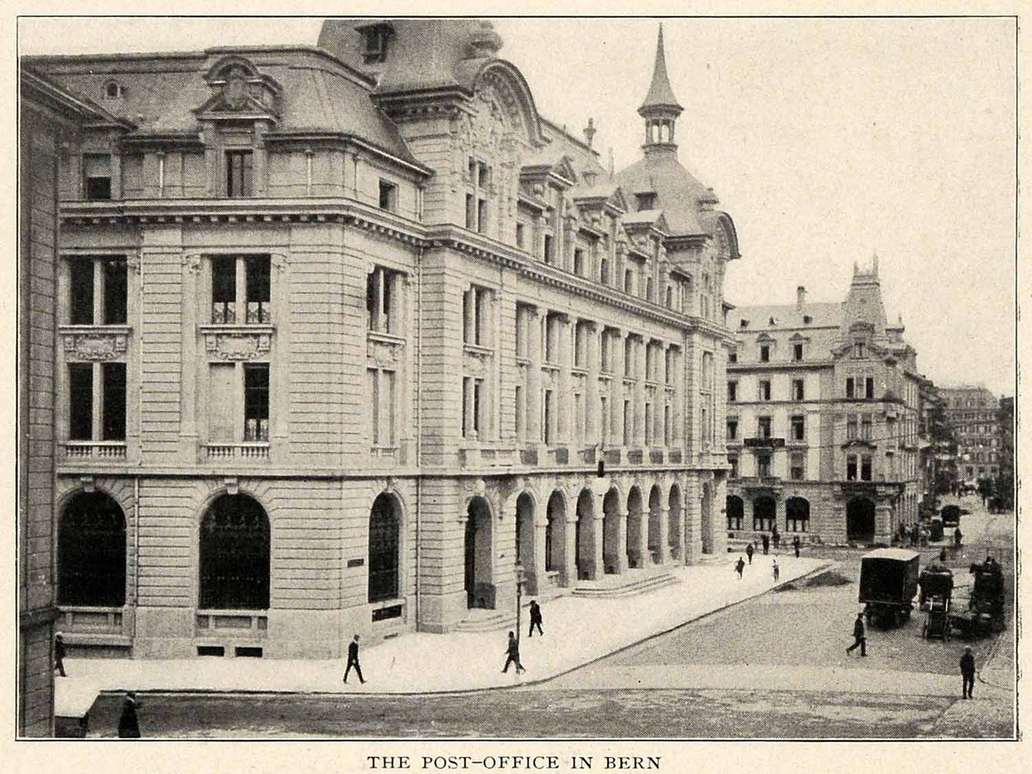 This is an original 1910 halftone print of the Post-Office building in Bern, Switzerland. Please note the dimensions of this item.