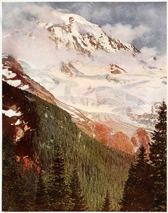 This is an original 1910 color print of the view from Ptarmigan Ridge onto the Canyon of the North Mowich Glacier and up to the cloud-wreathed peak.
