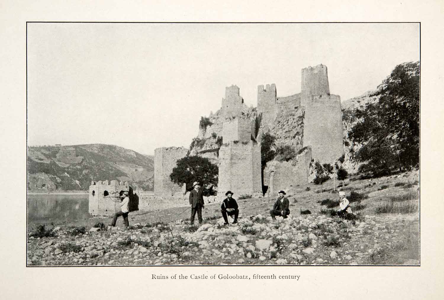 This is an original 1910 black and white halftone print of the ruins of Castle Goloobatz in Serbia. The group of men seen here appear to be relaxing except for the one shooting his rifle off into the river.