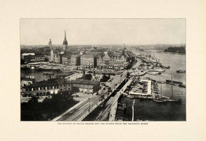 This is an original 1910 halftone print of the Slussen or Sluice Bridge and the Staden from ther Katarina Hissen.