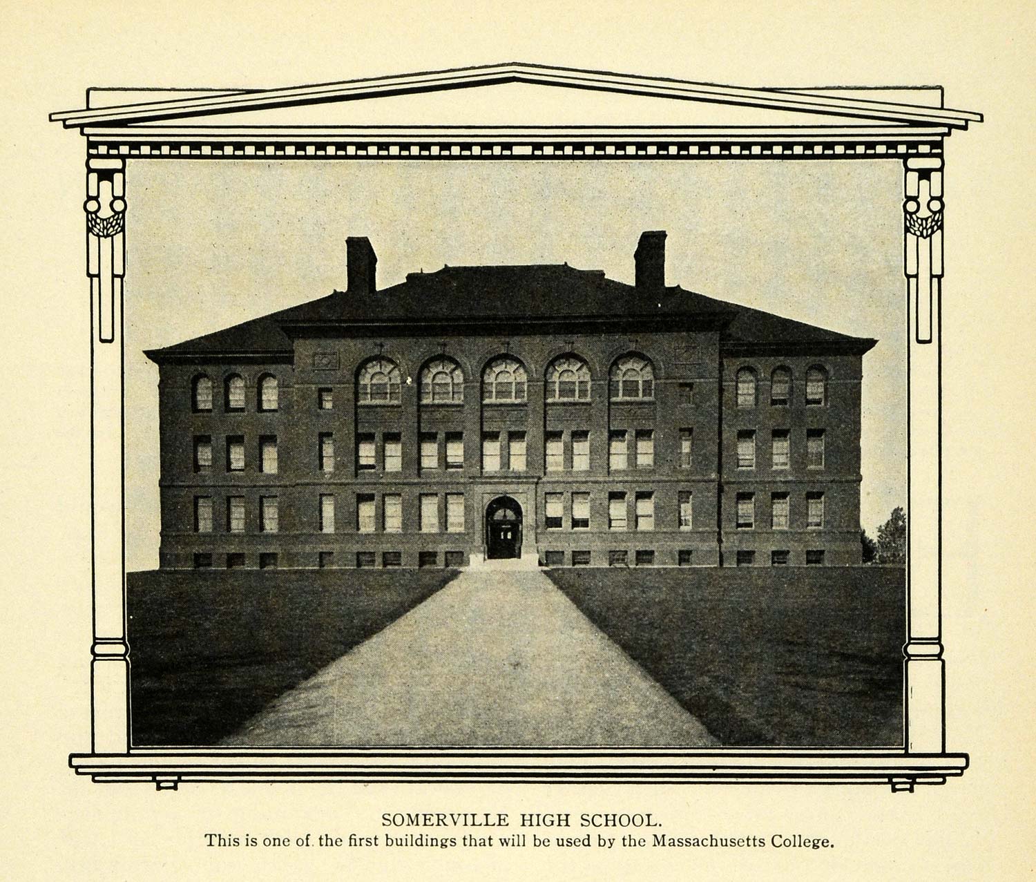 This is an original 1910 halftone print of Somerville High School-- one of the first buildings used by the Massachusetts College. The school opened in 1852 and is currently being used as the city hall.