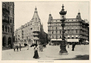This is an original 1910 halftone print of a street scene in Stockholm, Sweden.