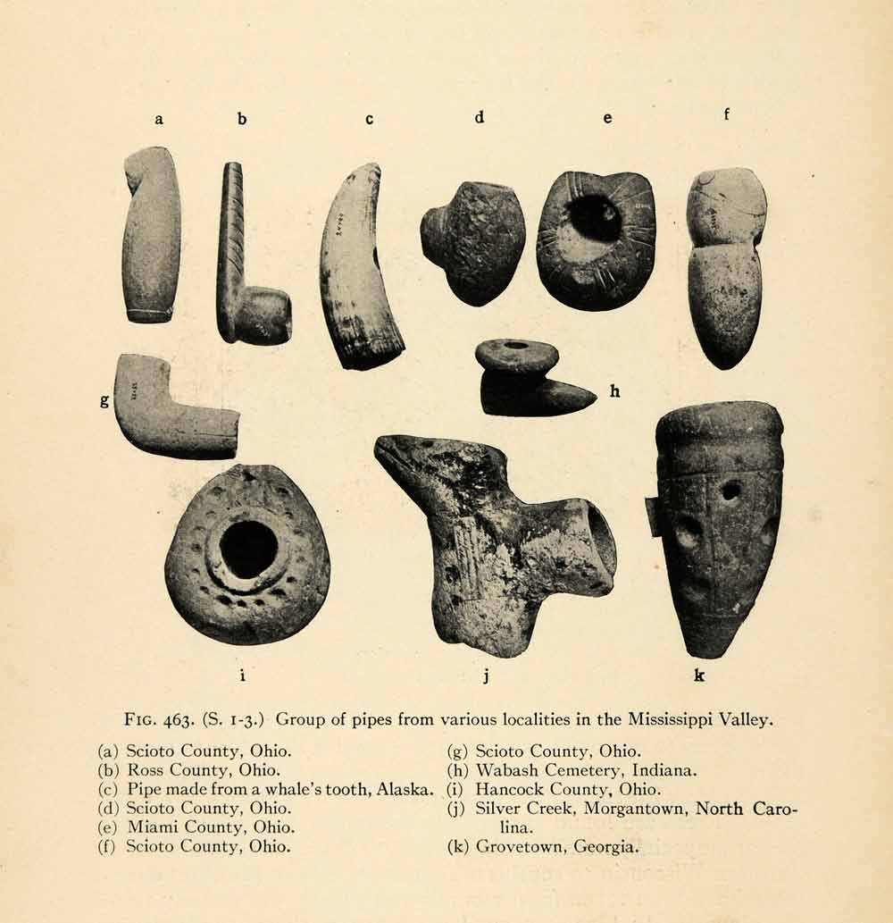 This is an original 1910 halftone print of various stone pipes found in the Mississippi Valley. Seen are pipes found in Scioto County, Ross County, Miami County, and Hancock County of Ohio. Also shown are pipes found in Wabash Cemetery of Indiana, Silver Creek, North Carolina, and a pipe made from a whale's tooth in Alaska.