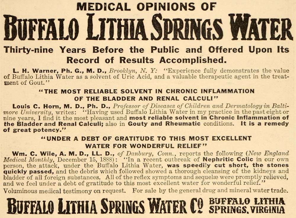 This is an original 1910 all-text black and white print ad for the curative powers of Buffalo Lithia Springs Water from the Buffalo Lithia Springs Water Co. of Buffalo Lithia Springs, Virginia.