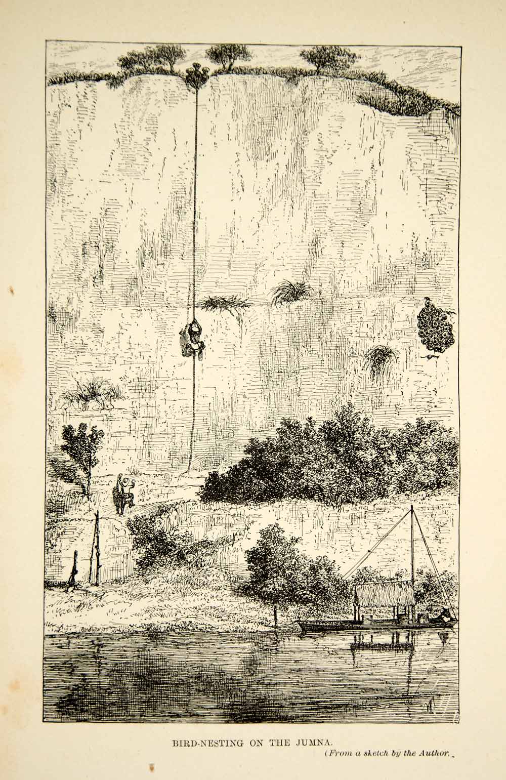 This is an original 1910 black and white wood engraving, from a sketch by American zoologist, William Temple Hornaday, of birds nesting in the cliffs along the Yamuna or Jumna River in India.