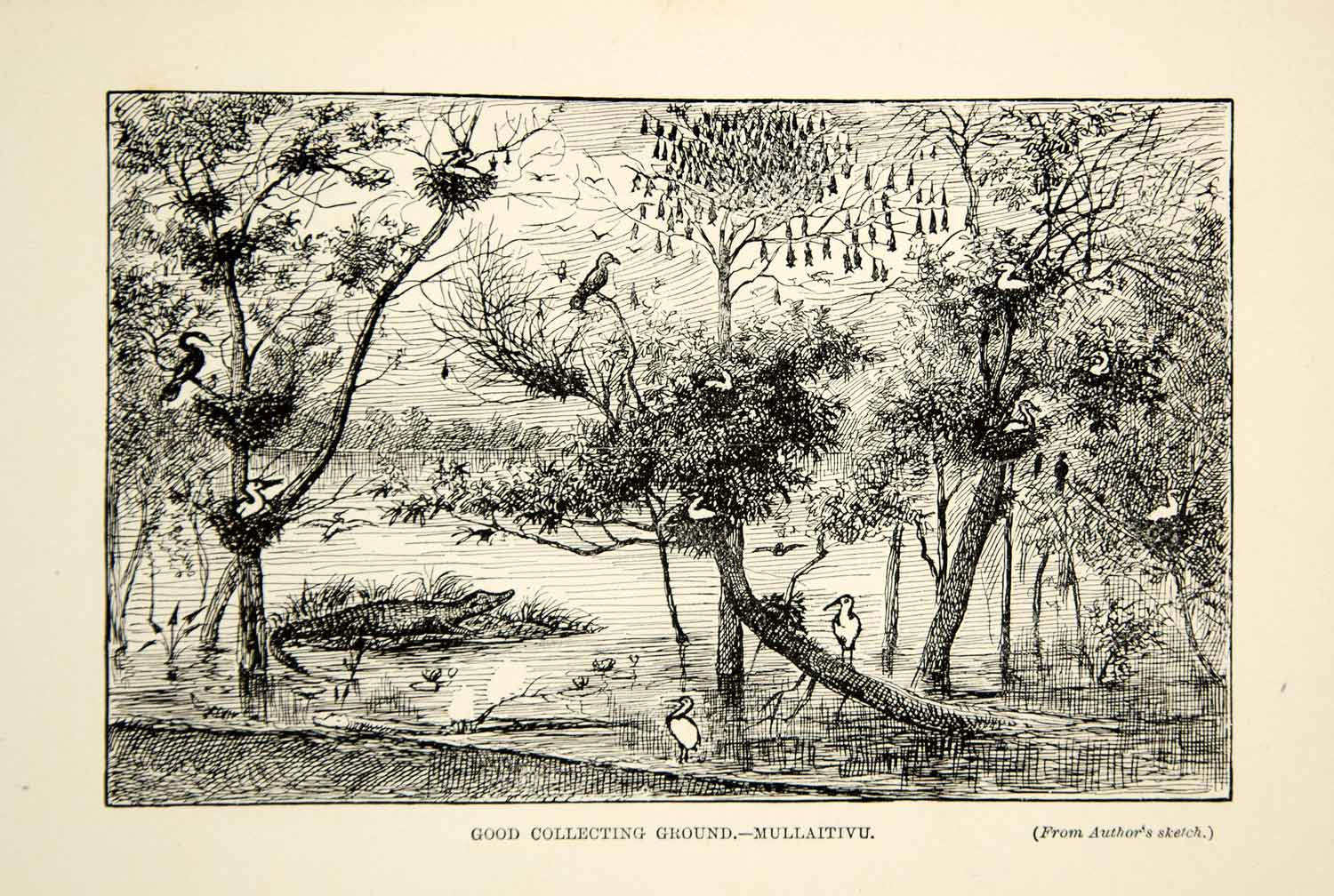 This is an original 1910 black and white wood engraving, from a sketch by American zoologist, William Temple Hornaday, of the hunting landscape near Mullaitivu, Sri Lanka.