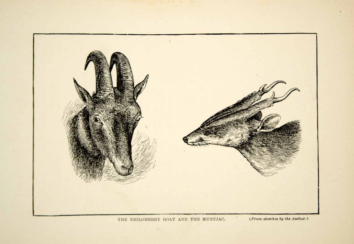 This is an original 1910 black and white wood engraving, from sketches by American zoologist, William Temple Hornaday, of a Nilgiri tahr and a muntjac in Southern India.